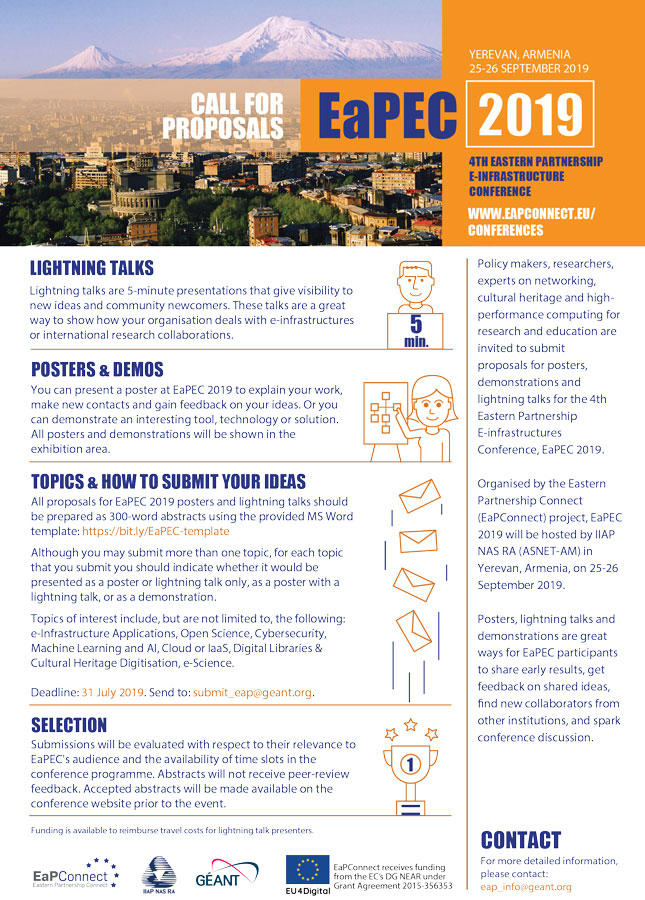 EaPEC 2019 is the 4th of these conferences and will be held on 25-26 September in Yerevan, Armenia, hosted by IIAP NAS RA (ASNET-AM) the research and education networking organisation of Armenia.