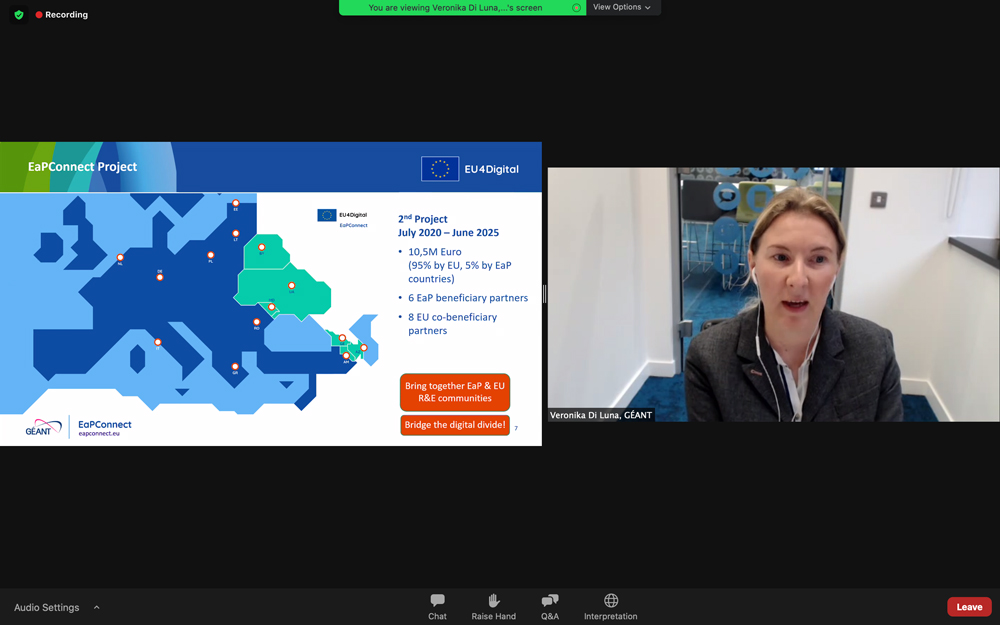 Screenshot of Veronika Di Luna of GÉANT presenting during the EU4Digital online EaPConnect kick-off event., ©GÉANT